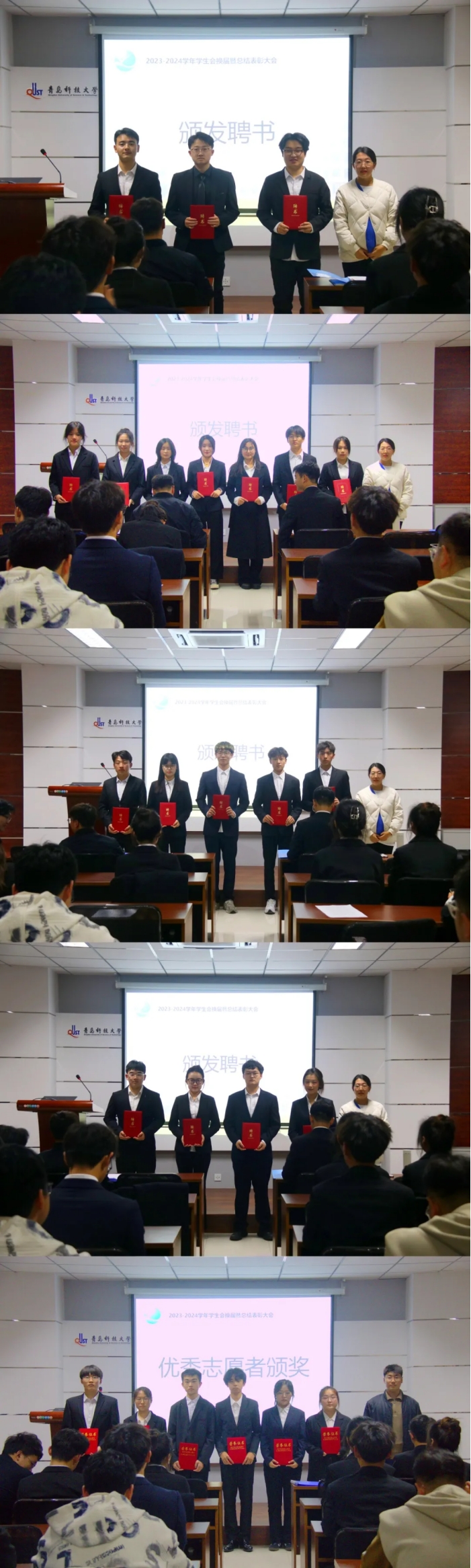对优秀学生会代表进行表彰。徐文丽为新一届学生会主席团、部长团成员代表颁发聘书;刘志飞为学生会优秀志愿者代表颁发荣誉证书。
