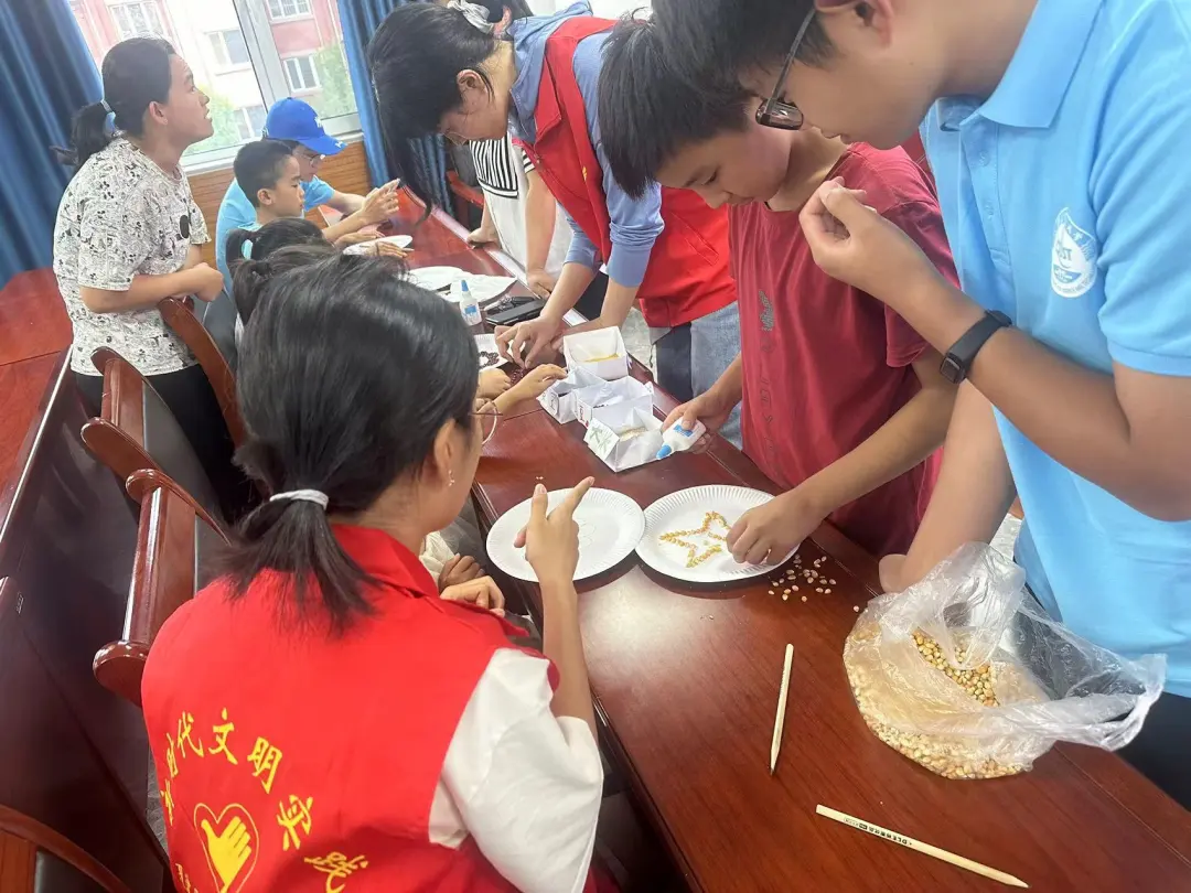 科普时间结束之后,志愿者们又为小朋友们介绍了粮食画的制作方法,小朋友们都跃跃欲试,接过志愿者分发的粮食,在纸板上拼出各种图案。