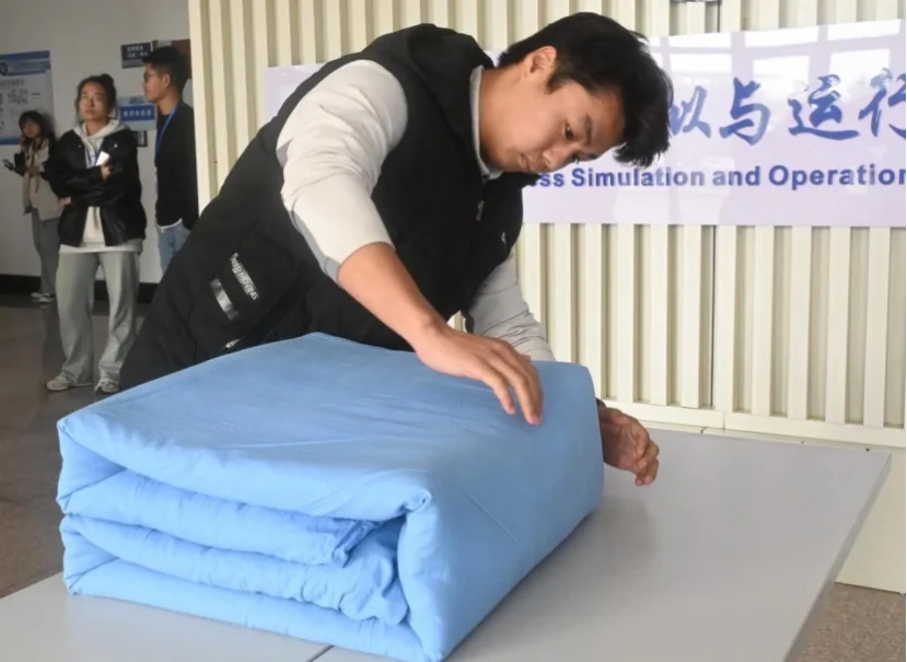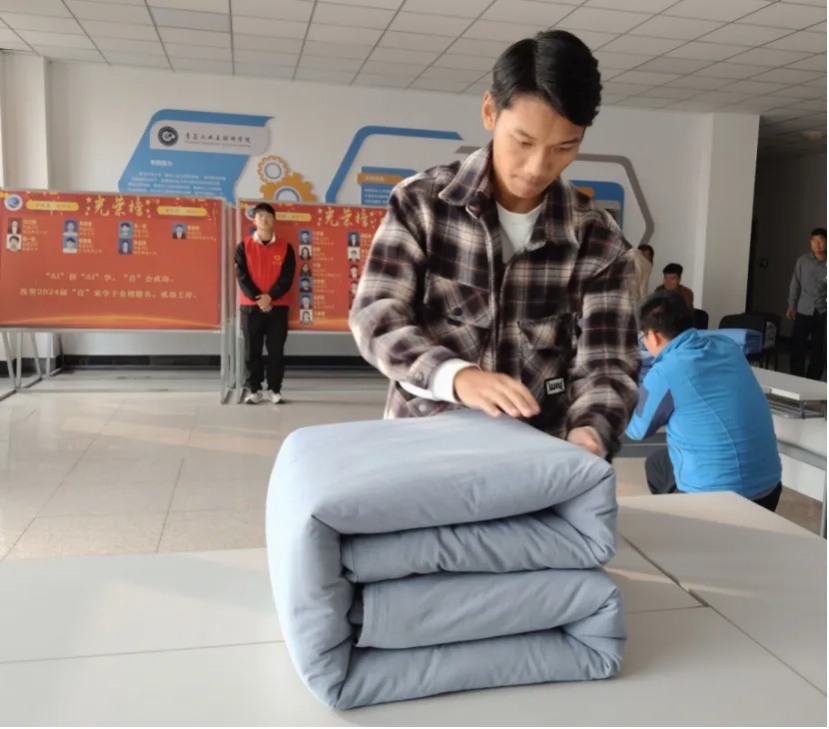 比赛正式开始,参赛者们展现出从容不迫的姿态,他们一丝不苟地遵循着叠军被的每一个步骤,将“压、折、抠、捏”的动作要领铭记于心。在每一次折叠与调整中,选手们不断追求极致的完美,细致入微地打磨着每一个角落,力求将被子塑造得更加规整。他们的专注与严谨,体现了对军被折叠艺术的尊重,以及对细节的极致追求,最终以娴熟的技艺,完成了这场关于军被折叠的竞技挑战。