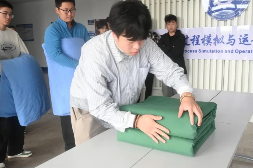比赛前,军协裁判人员宣读比赛规则,由退役士兵大学生现场为同学们演绎标准的军被叠法,通过“压,折,抠、捏”等精湛手法,将褶皱的被子精心塑造成一块四角挺括、线条流畅的“豆腐块”,为参赛者们树立了军被折叠的典范,激发了选手们的竞技精神,点燃了整个赛场的火热氛围。