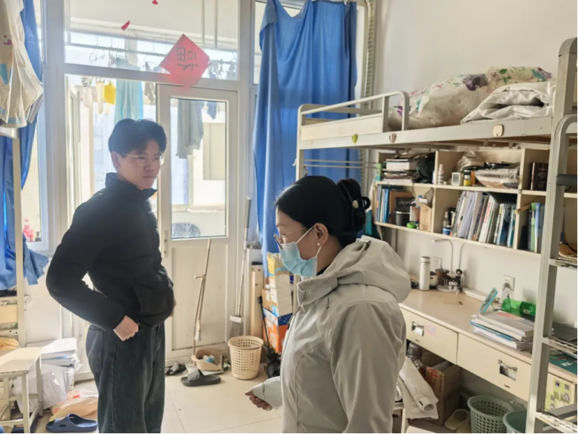党委副书记兼副院长刘名森和各年级辅导员深入走访学生宿舍,学生党员陪同走访。
