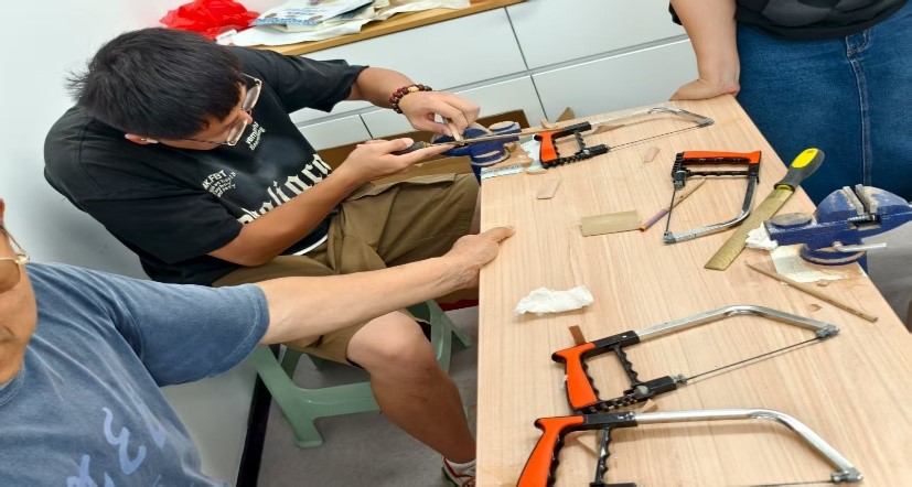 在学习环节,大学生们向现场的专业木工师傅学习锯子和锉刀的基础操作技巧,深入感受木梳制作全过程,为搭建“AI工坊”课堂奠定坚实理论基础。智行者团队运用AI技术将木匠工艺讲解转化为通俗指引并智能优化操作区域,为精准赋能非遗技艺传承搭建科学化、智能化、高效化平台。