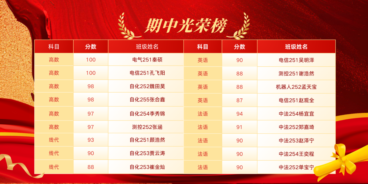 将依据考试成绩,评选出高等数学、线性代数、外语三门学科的前三名学生,并制作成“期中光荣榜”进行公示表彰。