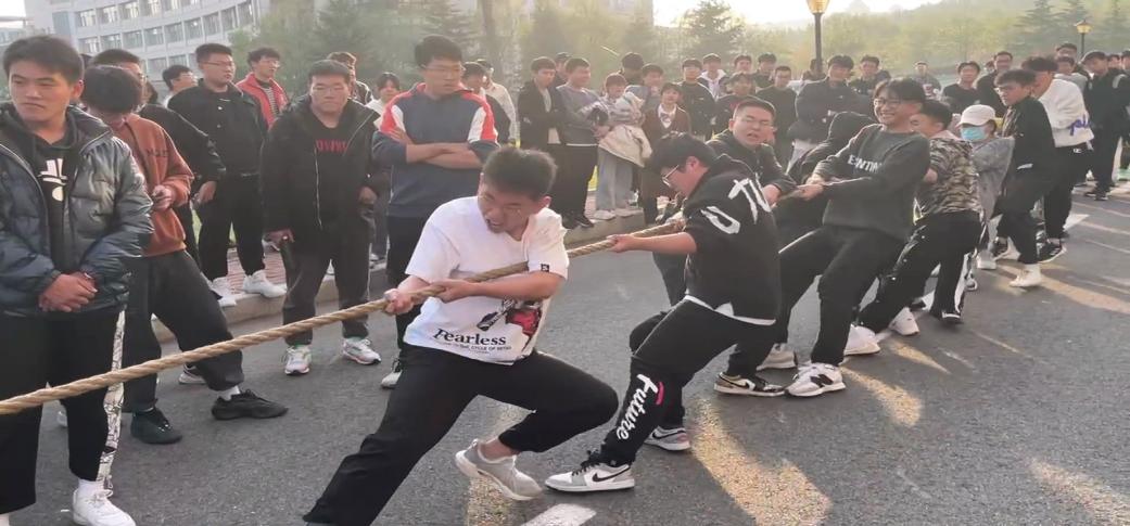 比赛中参赛队员双手紧握长绳,团结一心。班级内剩余的同学和路过的同学们自发组成啦啦队为本班人员加油。号子声、呐喊声,此起彼伏,飘荡在整个道路上空