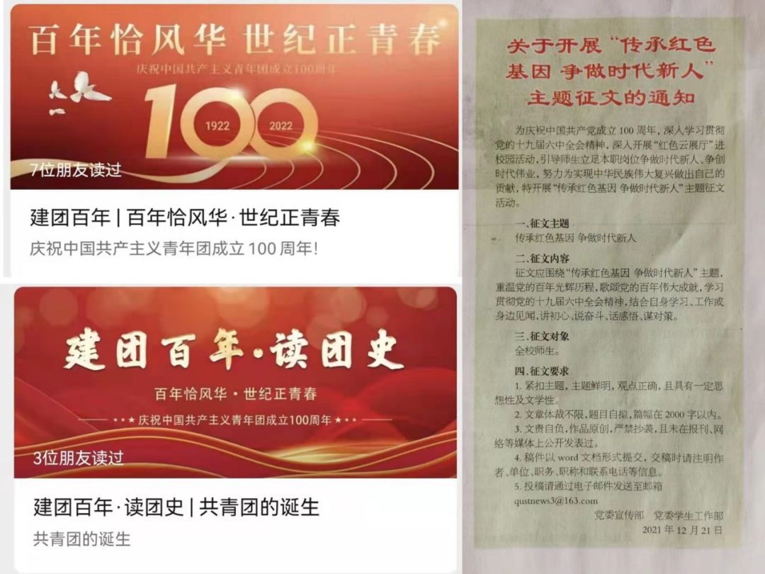 思想引领,夯实学业,引导学生“假期不停学”。假期期间确保思想引领不间断,充分利用社会和家庭两个大课堂,借力新媒体平台,公众号开设“建团百年”学习专栏,号召全体学生开展学习党的十九届六中全会精神、学习百年团史、红色云展厅等活动,撰写红色主题征文,实地参观革命纪念馆,感悟红色文化;聚焦学生主责主业,发挥“创业先锋”、“科创之星”传帮带作用,引导学生利用假期时间夯实专业基础,辅导员定期与学业困难学生及家长线上交流,共同制定学习计划。针对毕业生开展在线就业指导,密切关注各平台发布的就业信息,及时转达给学生,鼓励学生利用假期多寻找实习就业机会,营造就业创业良好氛围。
