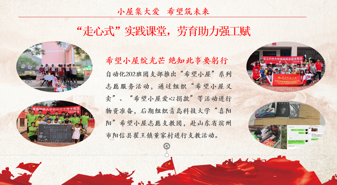 北苑团学报告厅进行团学活动展演。他们获批“希望小屋”儿童关爱项目后,通过线上线下深度融合,切实推进“希望小屋”儿童关爱项目做深做实。线下通过前期“希望小屋义卖”、“希望小屋爱心捐款”等活动进行物资准备,共筹集善款近千元及相关物资若干,后期组织“喜阳阳”希望小屋志愿支教团赴山东省滨州市翟王镇董家村,围绕党史宣传、科普教育、艺术拓展、课后辅导等内容展开,以形式多样的活动为载体,为当地孩子带来丰富的课堂内容;线上通过对当地儿童进行知识讲解与生活温暖投送,寄送支教照片及暖心小礼物,关爱乡村儿童的成长与生活。本次活动,该团队累计在今日头条、阳信融媒等多个媒体平台发布新闻21篇。切实促进学生在社会课堂中受教育、长才干、做贡献,践行“请党放心 强国有我”初心使命,深化第二课堂实践教育发展目标。