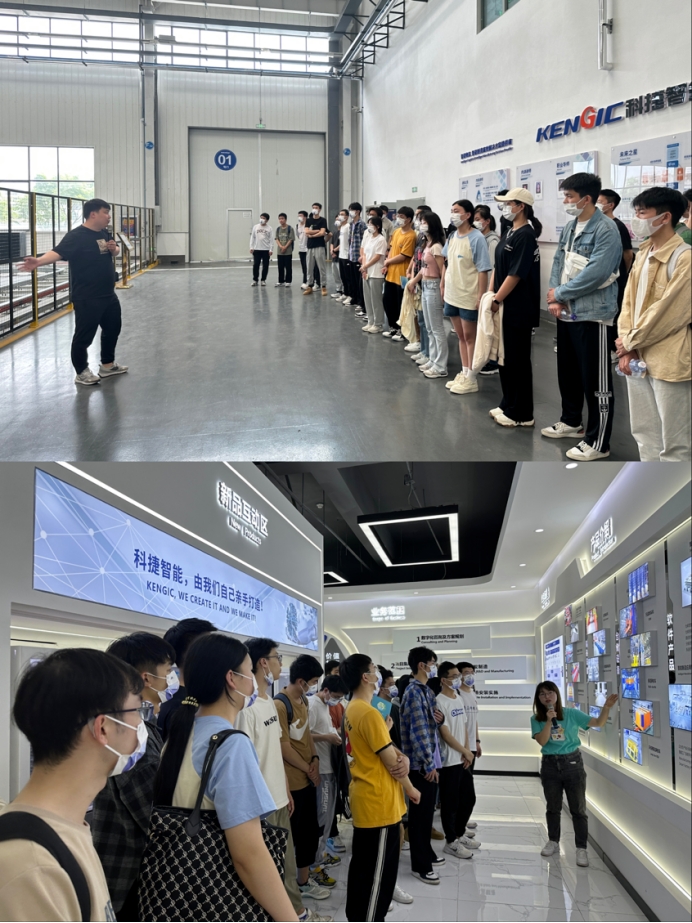 大学生创新创业实习实践基地——科捷智能科技股份有限公司,在公司人力资源总监郭增水等人的陪同下参观了企业发展文化墙,并进入工厂参观智能物流和智能制造设备。