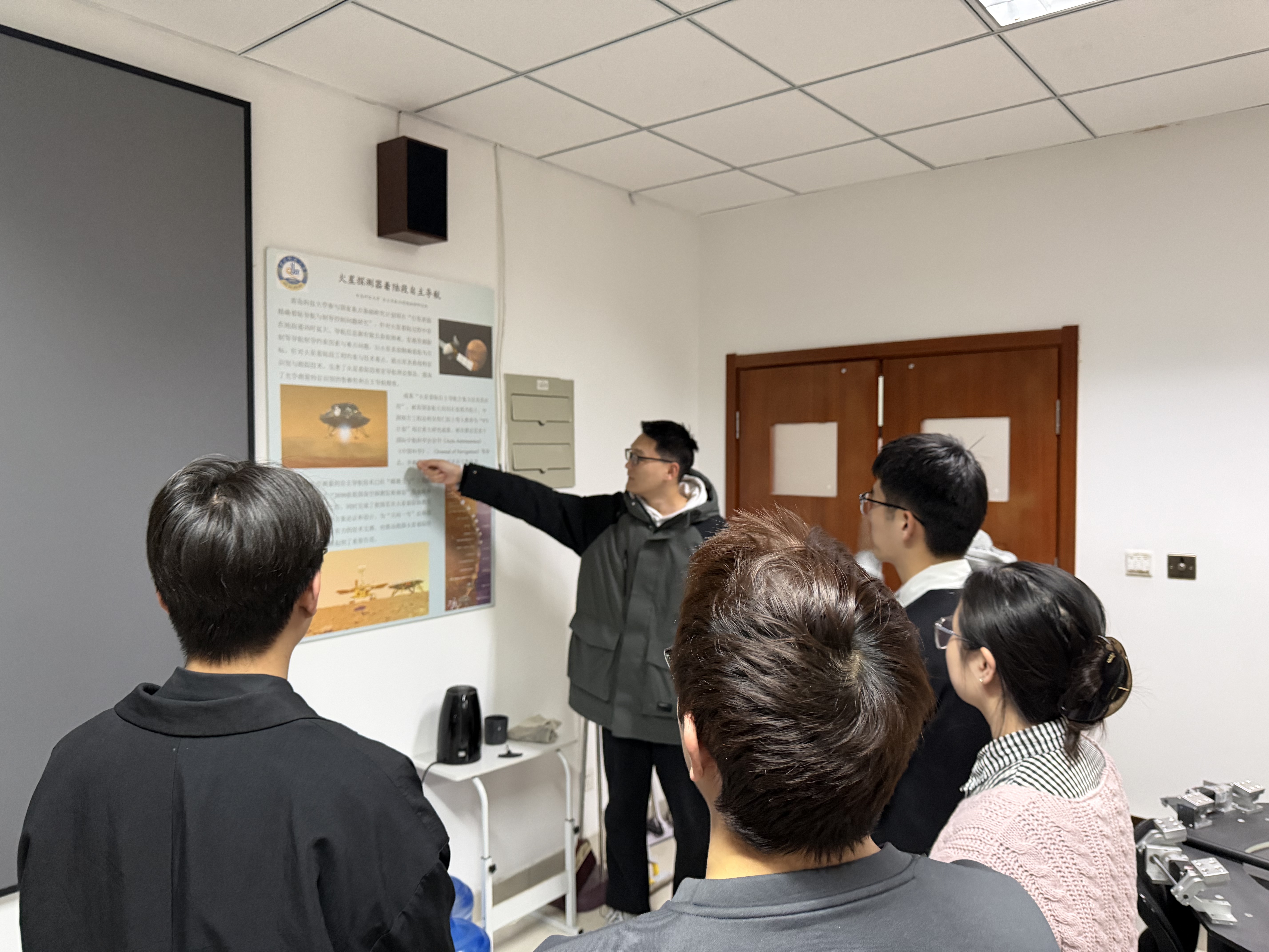 在实验室研究同学的带领下,依次参观了多个核心研究区域。实验室陈列的小天体模型吸引了众多同学驻足观看,研究同学详细介绍了小行星的地貌特征及其在深空探测中的研究价值,讲解了探测器在小天体表面着陆的技术难点与解决方案。随后,大家参观了实验室自主研发的火星车样机,研究同学结合实物模型,生动讲解了火星车的结构设计、移动系统、能源供应以及自主避障等功能,使同学们对火星探测任务有了更加直观和深入的理解。参观过程中,同学们认真聆听,积极提问,实验室浓厚的科研氛围和先进的实验设备给大家留下了深刻印象。